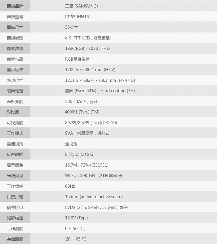 液晶屏尺寸 55 寸TFT真彩液晶屏