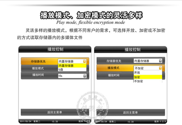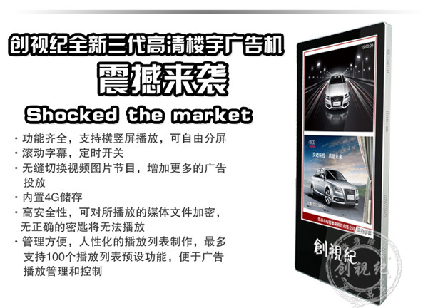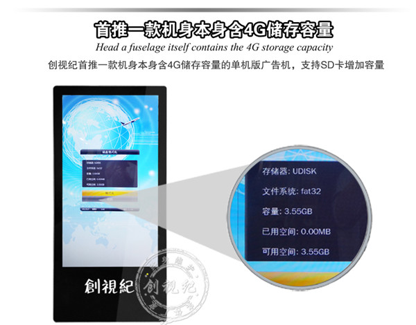 控制方式 | 通過U盤,SD卡播放播放 | 通過U盤,SD卡更新節(jié)目,直接將內(nèi)容導(dǎo)入機(jī)器內(nèi)存,(內(nèi)置4G 內(nèi)存)優(yōu)點(diǎn):客戶無需另配內(nèi)存卡;拷貝速度快 | 通過電腦用網(wǎng)絡(luò)(支持有線,wifi,可選3G)連接廣告機(jī),電腦后臺統(tǒng)一遠(yuǎn)程控制、管理 |