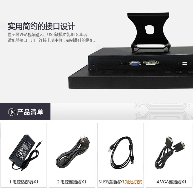 清 單: 顯示器主體 X1 電源適配器 X1 專用支架 X1 電源線 X1 保修卡 X1 合格證 X1