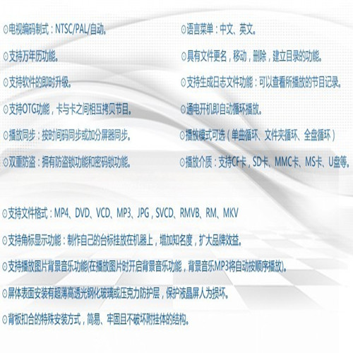 ●采用500+333M主頻MIPS+FPU及硬解碼,完美支持1920x1080P高清視頻文件,同時(shí)支持多個(gè)分屏播放及rss、PDF、幻燈片、TXT字幕文件等,為您完美展現(xiàn)多媒體數(shù)字標(biāo)牌魅力。