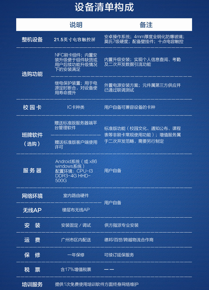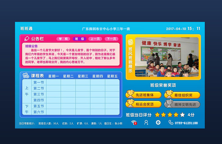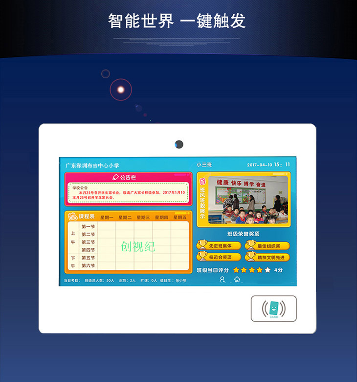 基礎數據庫系統是按照教育行業設計的標準數據庫,包括學校信息、教師信息、教室信息、學生信息、課程信息、班風班貌、德育評價、考試信息、考勤信息等,通過建設基礎數據庫系統可為教育信息化建設打造堅實基礎。產品備注:電容觸摸,可選擇帶刷卡功能或不帶刷卡功能,備貨尺寸:15.6寸、18.5寸、21 5寸,其他尺寸可訂做。