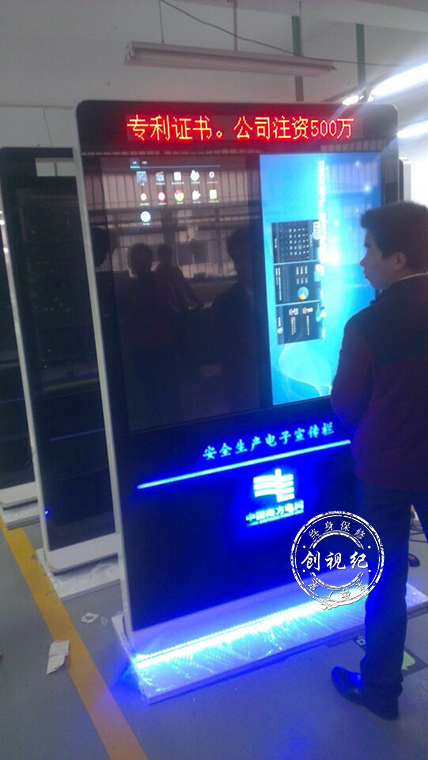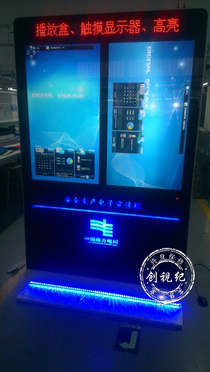 此次“安全生產電子宣傳欄”采用42寸單屏觸控的方式,安卓四核控制系統,雙屏上方采用P5 LED燈條,下方“安全生產電子宣傳欄”和“中國南方電網”字樣都是絲印透光顯示,顏色是金典的“中國南方電網”藍,并且底座部分也是有藍色的LED燈條顯示。42寸人民日報式觸控一體機,采用鋁合金包邊并且鑲有乳白色鋼琴烤漆,顯得高大上。軟件方面,采用采用端到端加密機制,避免非法信息發布和傳播,用J2EE技術開發、支持跨平臺移植、模塊化設計,簡單易上手、快速業務發放。遠程分組控制終端終端運行情況一覽無余,遠程監控終端當前播放內容,平臺、終端雙重加密確保信息安全,防盜性高,平臺軟件支持嵌入式操作系統,確保服務器長時間的穩定運行,平臺軟件可兼容WindowsAndroid、Linux播控終端無論是LAN、WIFI還是3G都可統一進行管理控制.