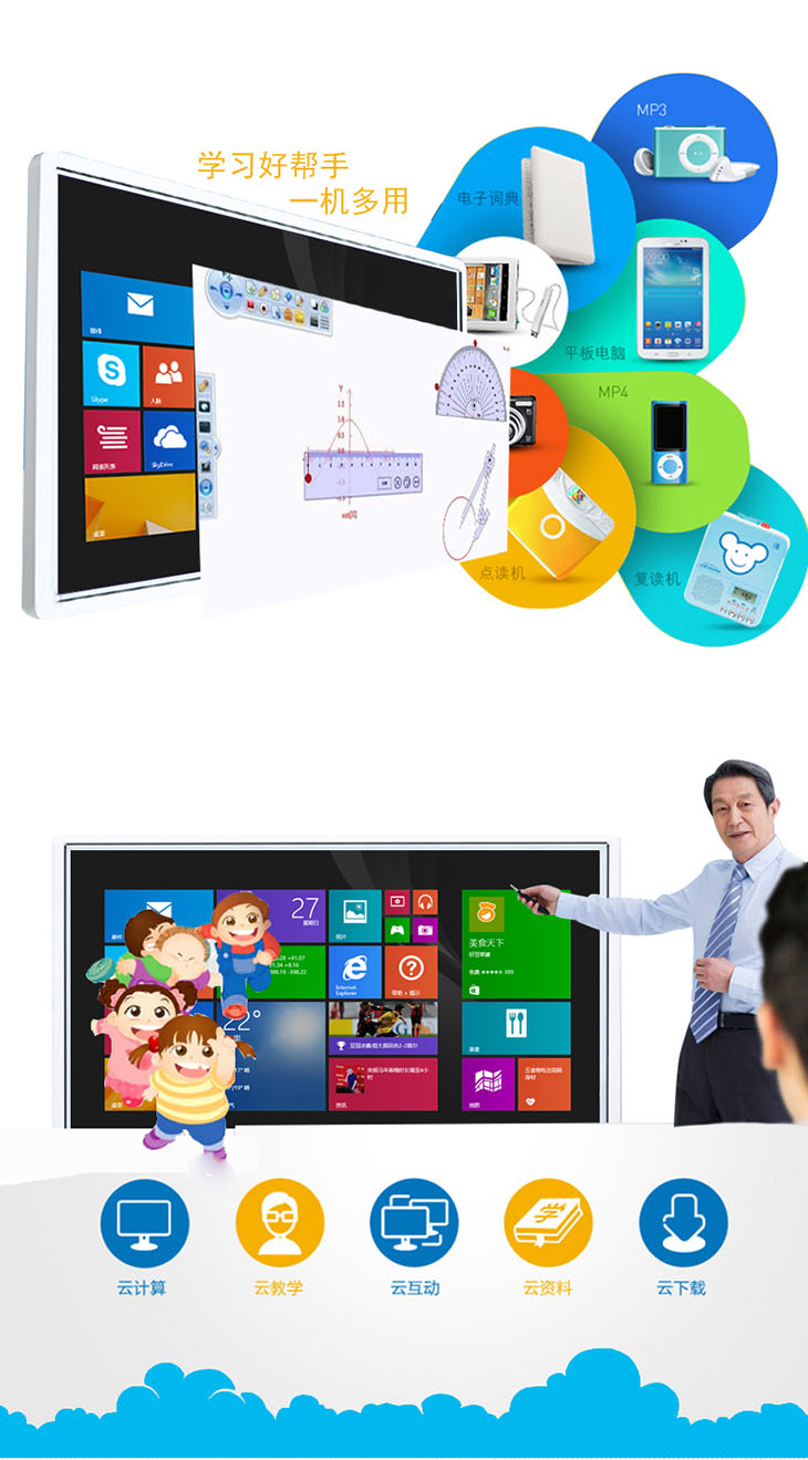 其還具有4K分辨率,畫(huà)質(zhì)細(xì)膩,細(xì)節(jié)更清晰;濾藍(lán)光和減少閃屏技術(shù)讓學(xué)生和老師的觀感更舒適;支持多點(diǎn)紅外觸控,讓老師更好的操控各種功能,并可以讓多個(gè)學(xué)生一同板書(shū);配合內(nèi)置Qtouch白板軟件,讓學(xué)習(xí)更具樂(lè)趣,即時(shí)更新海量課件資源,老師可以獲取更多知識(shí)點(diǎn)課件,內(nèi)容常換常新。